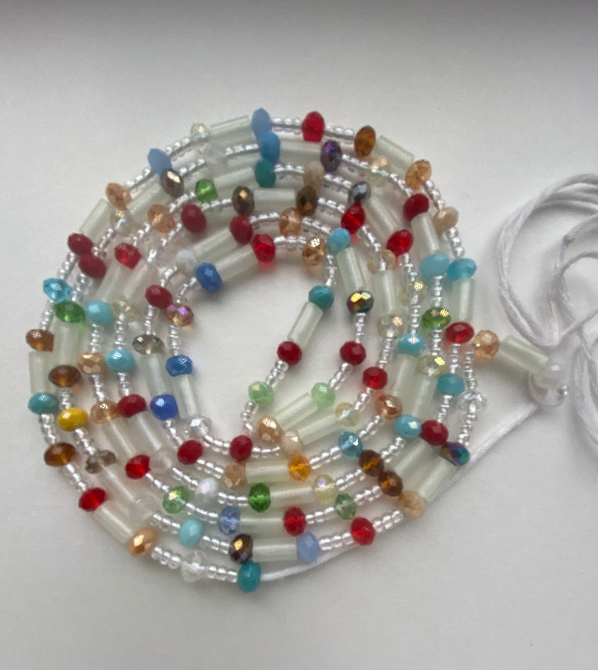 50 inches of glow in the dark beads and crystals. Can comfortably fit up to a size 3x.